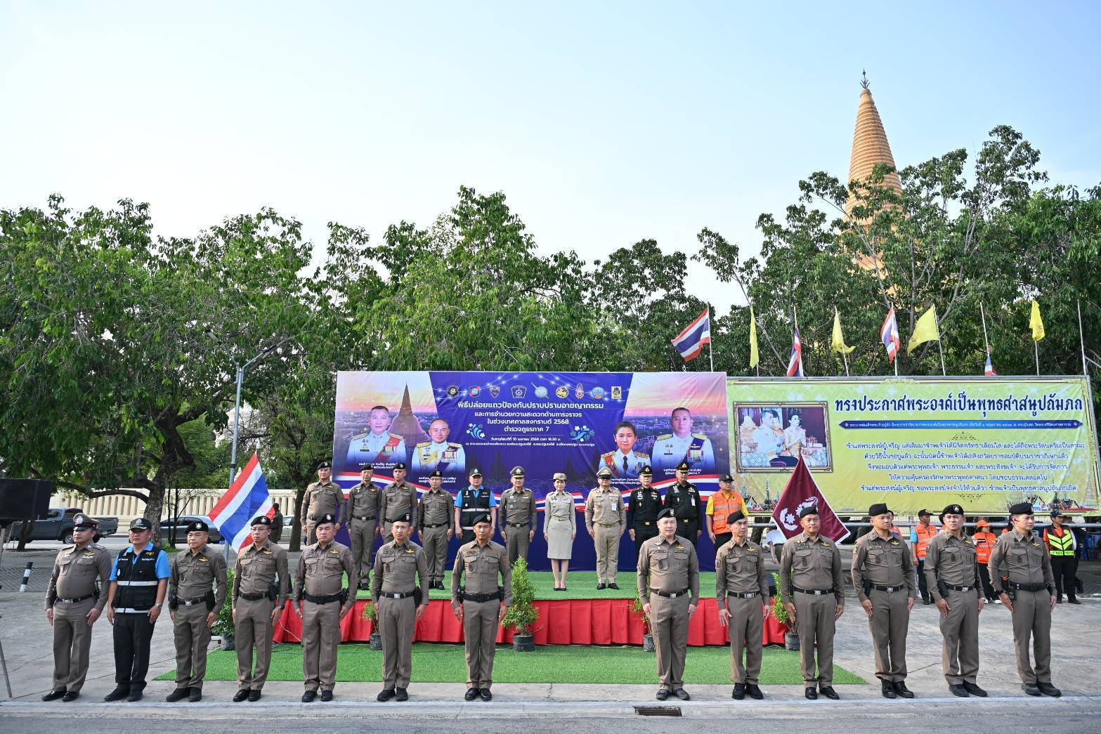 ขวัญ “ขับขี่ปลอดภัย เมืองไทยไร้อุบัติเหตุ” โดยบังคับใช้กฎหมายใน 10 ข้อหาหลัก โดยบูรณาการกำลังทั้งภาครัฐและภาคเอกชน ประกอบด้วย ข้าราชการตำรวจในสังกัดตำรวจภูธรจังหวัดนครปฐม ตำรวจทางหลวง ตำรวจจท่องเที่ยว ตำรวจตรวจคนเข้าเมือง ตำรวจปราบปรามยาเสพติด เจ้าหน้าที่ทหาร ฝ่ายปกครอง และอาสาสมัคร เข้าร่วมพิธีปล่อยแถวระดมกวาดล้างในครั้งนี้ รวมทั้งสิ้น 420 นาย
